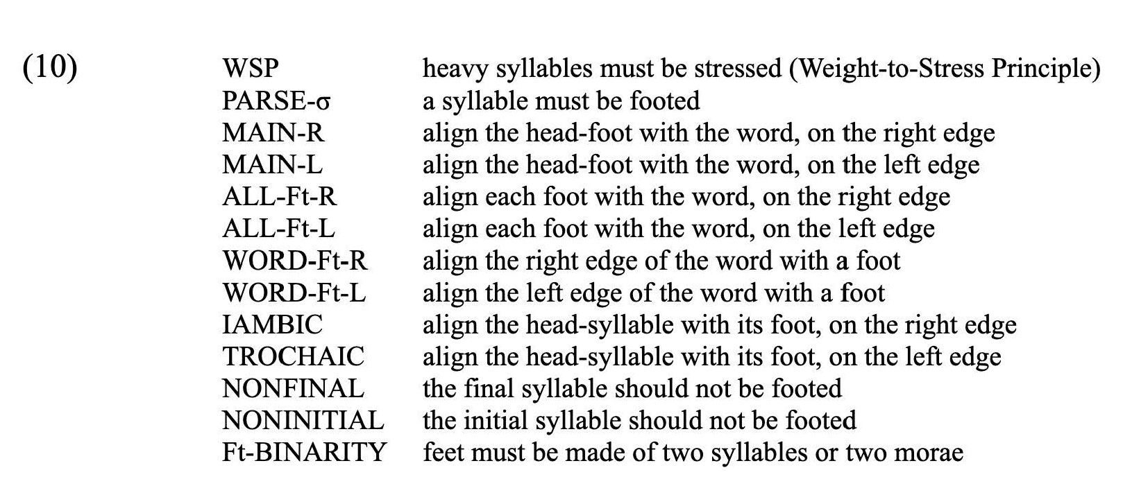 In (11), candidate 4 is eliminated first, with candidates 1 and 2 following in subsequent rounds. Candidate 3 surfaces as the most optimal, since it has incurred no violations. A simplified analysis of the French stress system will be used for demonstration. It is agreed that French is a language without lexical stress, with prominence falling on the final syllable of a prosodic phrase (Dell, 1984). The question of whether this prominence is purely intonational or a product of metrical parsing is still up for debate (for a discussion see Goad & Prévost, 2011). For the sake of simplicity, this analysis assumes that French phrase-final prominence is a representation of stress in the form of a right-aligned iambic foot. Thus, the two constraints that will be used are IAMBIC and MAIN-R. The constraints are defined below: