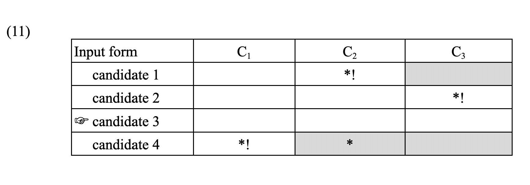OT analyses are represented in a tableau, as in (11). The leftmost column contains the input form/underlying representation, along with the generated possible output candidates. Along the top row, constraints (C) are presented in descending order of rank. An asterisk (*) denotes one violation of a constraint, with (!) indicating a fatal violation, meaning that the candidate is out of the running. (☞) denotes the most optimal candidate, or the form that incurred the least number of violations. Shaded boxes are included for clarity, signifying a candidate is no longer in the running.