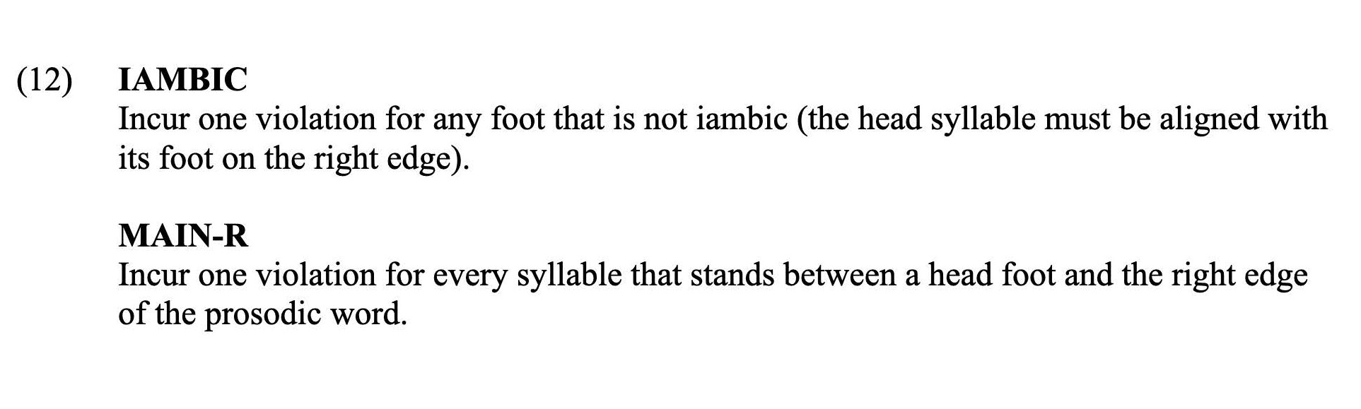 In (11), candidate 4 is eliminated first, with candidates 1 and 2 following in subsequent rounds. Candidate 3 surfaces as the most optimal, since it has incurred no violations. A simplified analysis of the French stress system will be used for demonstration. It is agreed that French is a language without lexical stress, with prominence falling on the final syllable of a prosodic phrase (Dell, 1984). The question of whether this prominence is purely intonational or a product of metrical parsing is still up for debate (for a discussion see Goad & Prévost, 2011). For the sake of simplicity, this analysis assumes that French phrase-final prominence is a representation of stress in the form of a right-aligned iambic foot. Thus, the two constraints that will be used are IAMBIC and MAIN-R. The constraints are defined below: