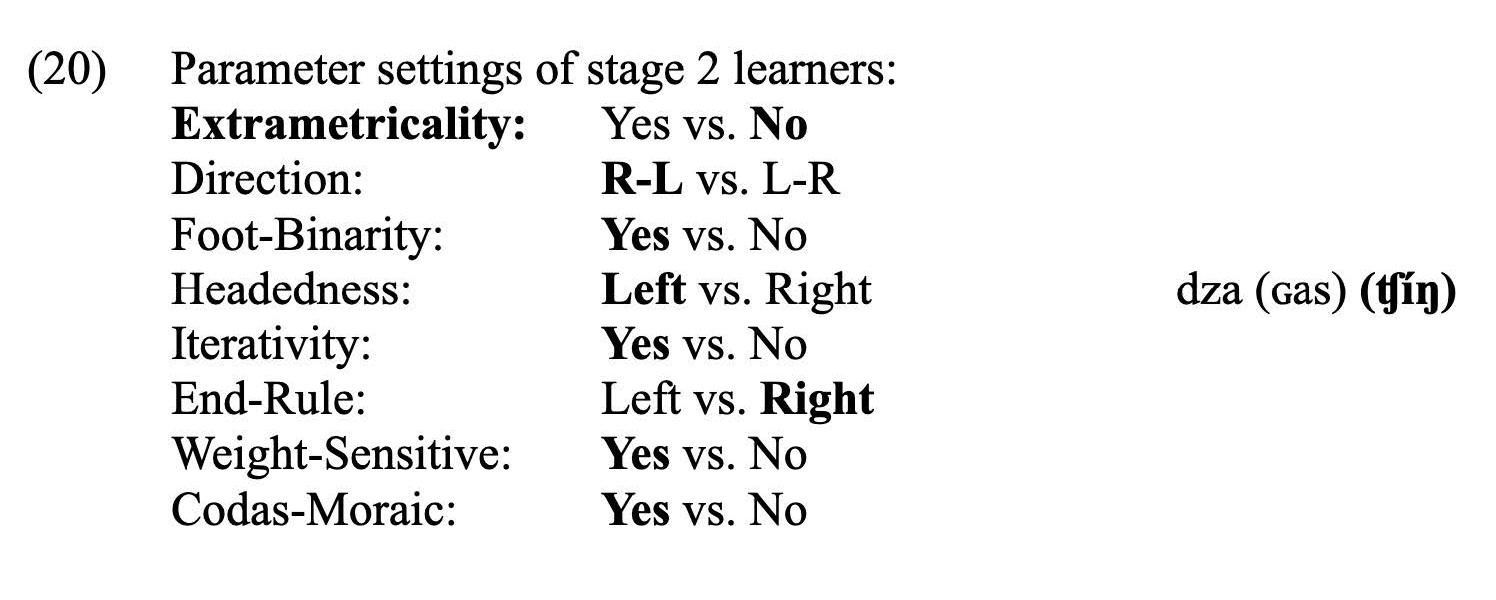 The author found that many of the errors produced by the English speakers were largely defined by their level of experience, or more specifically, their stage of acquisition (Özçelik, 2016). For example, when presented with Mongolian words containing all light syllables, e.g. загасчин [dzá.ɢas.ʧiŋ], novice learners seemingly applied English stress parameters to the word, yielding *[dza.ɢás.ʧiŋ]. The novice learners had presumably not yet learned that coda consonants in Mongolian do not carry morae, which led them to place primary stress on the penultimate closed syllable7. Different learners who made the same errors were later organized into one of five groups, with each group reflecting a stage in the path of acquisition. At each stage, the most common error was ascribed to the resetting of a specific parameter. Learners who incorrectly placed stress on the penultimate syllable of [dza.ɢás.ʧiŋ] were placed into group 1, since none of their parameters were assumed to be reset.