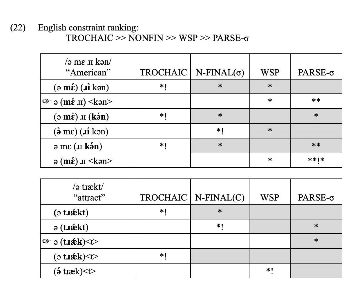 These constraints’ rankings are practically reversed in English, as demonstrated in (22). English stress placement is determined by various other constraints, such as Ft-BINARITY and MAIN-R, however only the relevant constraints relative to Mandarin are presented here. Furthermore, as mentioned above, English extrametricality varies by word class. Nouns are thought to have syllable extrametricality, while verbs typically have consonant extrametricality. Ou frames this difference in extrametricality through two non-finality constraints which differ based on word class. NON-FINAL becomes NON-FINAL(σ) in nouns, and NON-FINAL(C) in verbs. Tableaux for both an English noun and verb are provided in (22).