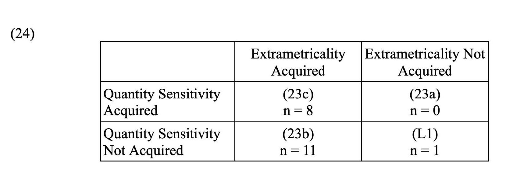Learners in an intermediate stage who display sensitivity to syllable weight and not extrametricality were not attested, going against the predicted ranking in (23a). This implies that constraint reranking is restricted, or that certain constraint must be reranked before another is demoted or promoted. Ou claims that this implication warrants further revisions to the existing model of OT constraint reranking, since previous assumptions postulated that all possible rerankings could potentially account for attested variation in errors. A later study conducted by the authors (Ou & Ota, 2015, mentioned above) ascribes the acquisition of extrametricality in nouns and verbs to generalizations or analogy, which could explain the asymmetrical acquisition of extrametricality displayed in this study. Further research is required to better understand the processes which trigger constraint reranking, and whether the acquisition of quantity sensitivity is treated differently than that of extrametricality among other populations of learners.