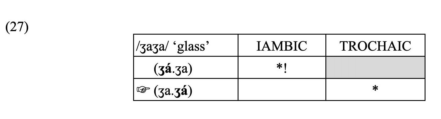In disyllabic English nouns (coffee, attic, object), these learners appear to apply their L1 constraint rankings, yielding the suboptimal form in (28a). In order to place stress on the correct syllable, learners would need to demote IAMBIC below TROCHAIC, as seen in (28b). A demoted constraint is represented in boldface in a shaded box.