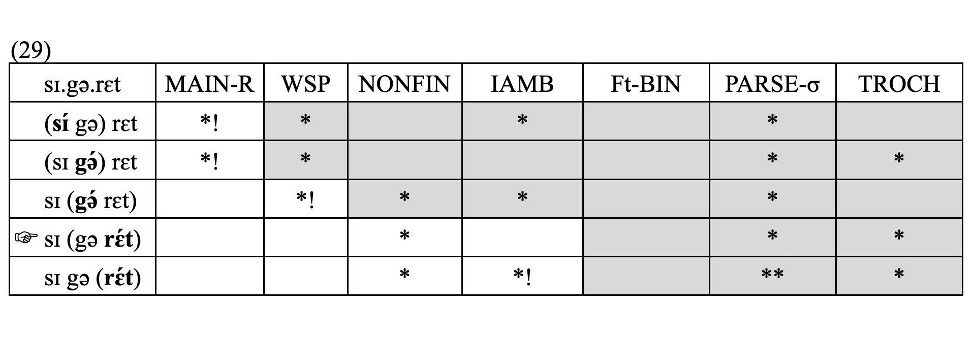 During the learning process, however, as learners begin to rerank their constraints hierarchies one at a time, stress placement patterns emerge which are not attributed to the rankings of either the L1 or the L2. In MA learners, a common stress placement error was the pronunciation of cigarette with penultimate stress, as in cigárette, an error made by 67% of learners (Mohamed, 2021, p. 12). This error cannot be attributed to the L1 constraint rankings of MA presented in (25), as demonstrated below in (29). The unchanged MA constraint rankings would yield the output cigarétte.