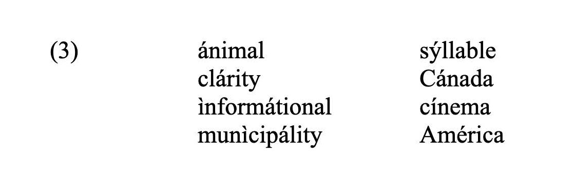 One of the main tenets of metrical phonology is the foot (Ft, less commonly Σ), which is the minimum constituent used when grouping stress patterns or assigning stress rules (Hayes, 1995, p. 40; Roca, 1992; Selkirk, 1980). Feet can either be disyllabic, made up of two syllables, or monosyllabic, made up of one heavy syllable. This depends on syllable weight and foot binarity minimums and maximums in a language, which will be discussed shortly. Within a foot, one syllable (the head syllable) carries more prominence over the other. Left-headed feet (σ́ σ) are considered trochaic, while right-headed feet (σ σ́) are considered iambic. In multisyllabic words, syllables are grouped into feet, which are subsequently grouped into larger constituents, such as the prosodic word (PWd/ω) or the prosodic phrase (PPh/φ), thus creating a hierarchical structure. Feet can be built beginning at the right edge of the word and moving towards the left, or from left to right. For example, the stress assignment rule for English nouns containing more than three syllables is as follows: skip over the final syllable and build trochaic feet from right to left, with main stress falling on the head syllable of the rightmost foot (Hammond, 1995, p. 318). Examples of unparsed stress patterning in English are given below in (3):
