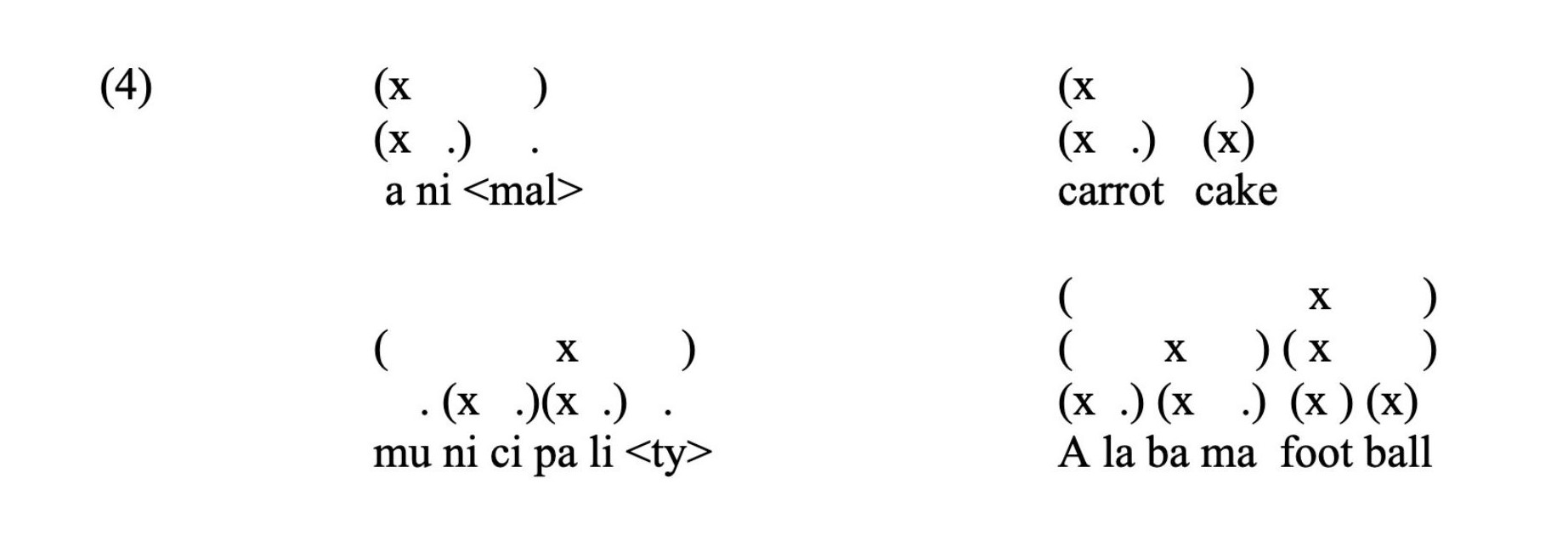 Various methods for representing such groupings have been proposed, such as tree theory (Liberman & Prince, 1977), or the bracketed grid (Halle & Vergnaud, 1987; Hayes, 1981). The representation adopted here is the version of the bracketed grid seen below in (4) introduced by Hayes (1995, p. 39), where an ‘x’ represents a stress-bearing syllable and ‘.’ represents a stressless syllable. The bottom row represents the foot level, where foot boundaries are marked by parentheses. The second row represents stress at the PWd level, with edges marked by parentheses, and the third row represents stress at the level of the PPh. Metrical groupings of various English words are shown in (4):