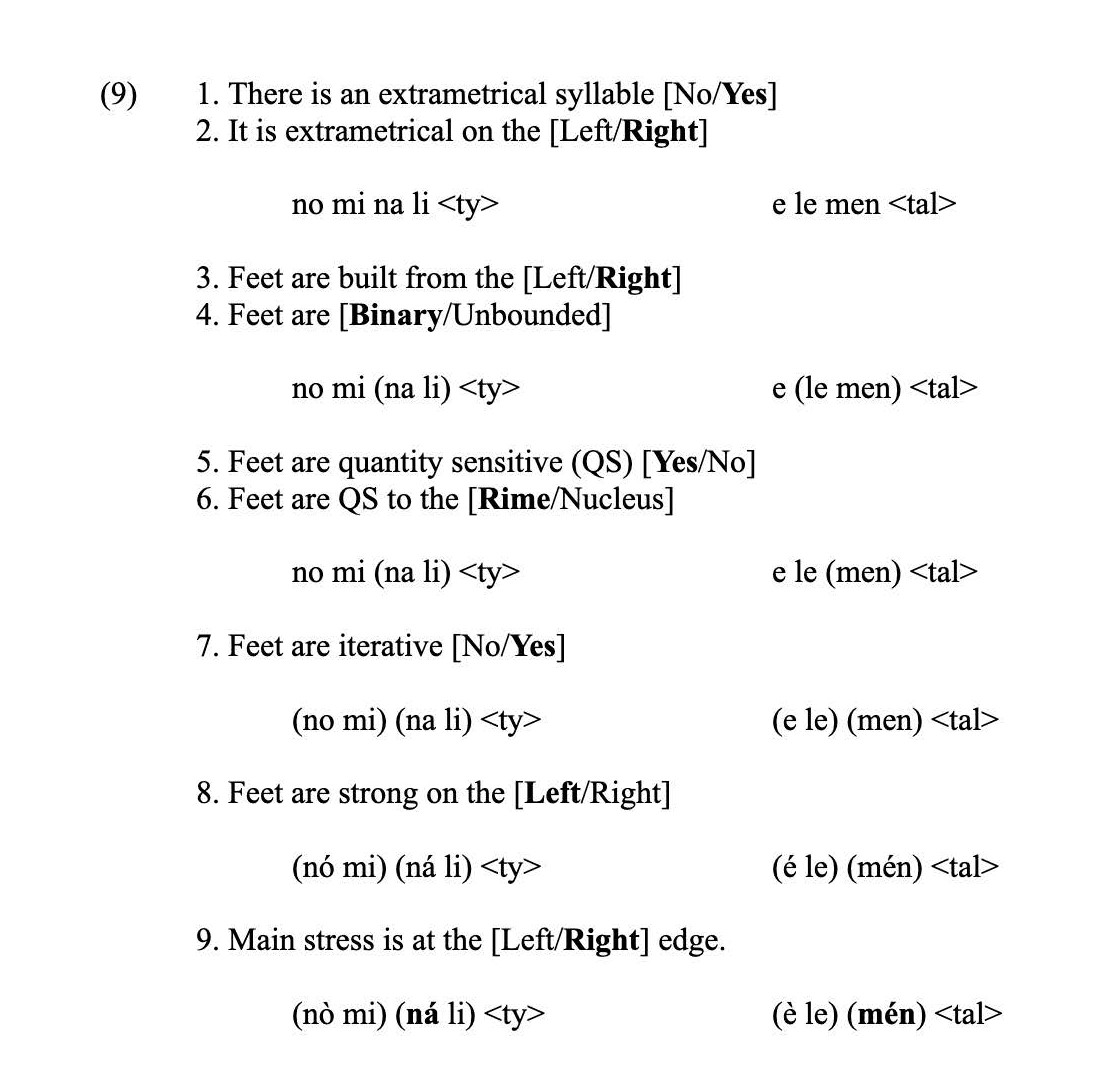The parameter settings relevant to English stress placement will be demonstrated for explanatory purposes in (9). Each parameter will be presented with its English setting along with a subsequent step-by-step parsing of a five-syllable word made up of all light syllables (nominality), as well as a four syllable word with a heavy penult (elemental). Note that the ordering of the parameters is arbitrary.
