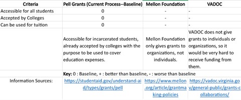 A major struggle when going through iterations of our prototype was finding long-term dependable funding. We started by only looking at donations, which are not a constant source of funding. As of July 2023, Federal Pell Grants, which low-income students pursuing a degree, became available for incarcerated students. This allows us to cover tuition costs through the Pell Grants and only needs to rely on other grants and donations for overhead costs from individual contributors, Mellon Foundation, and other Department of Justice (DOJ) grants. To obtain Pell Grants the students need to fill out a FAFSA form, which we will aid and work with the student to ensure the tuition payments reach the university they are enrolled in.